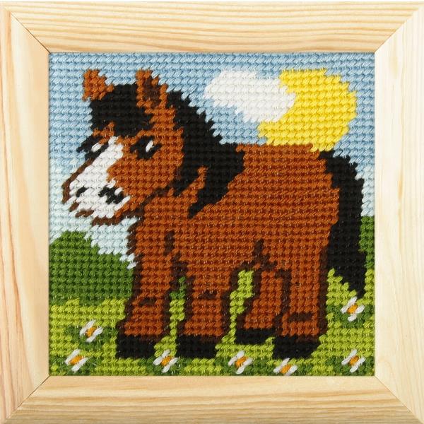Otroški gobelin z okvirjem, dimenzij 10 x 10cm, priložene so prejice za vezenje in šivanka s topo konico, motiv je natisnjen na stramin.