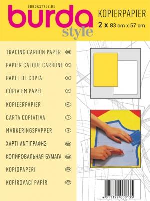 Kopirni papir za prenos krojev in oznak na blago. V kompletu sta bel in rumen papir, primerna za označevanje na temnejšem blagu.