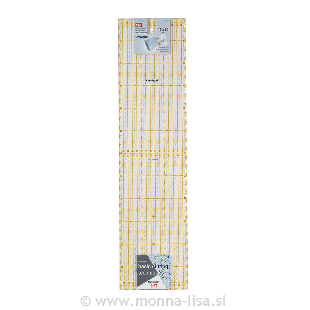 Dolgo pravokotno ravnilo dimenzij 15 x 60 cm, z narisano mrežo, za lažje rezanje blaga na trakove, kvadrate, trikotnike.