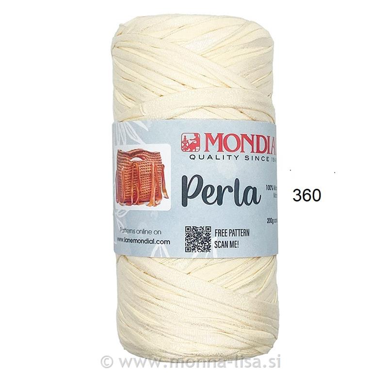Preja Perla je zelo simpatična preja za izdelavo torbic, košar, modnih dodatkov... Preja je v obliki traku, na eni strani mat, na drugi strani svetleča v enaki barvi. Perla je mehka ter tanka in dobavljiva v štirih čudovitih poletnih barvah. Za izdelavo manjše torbice potrebujete 300/400 g, za izdelavo večje torbe pa 700/800 g.
