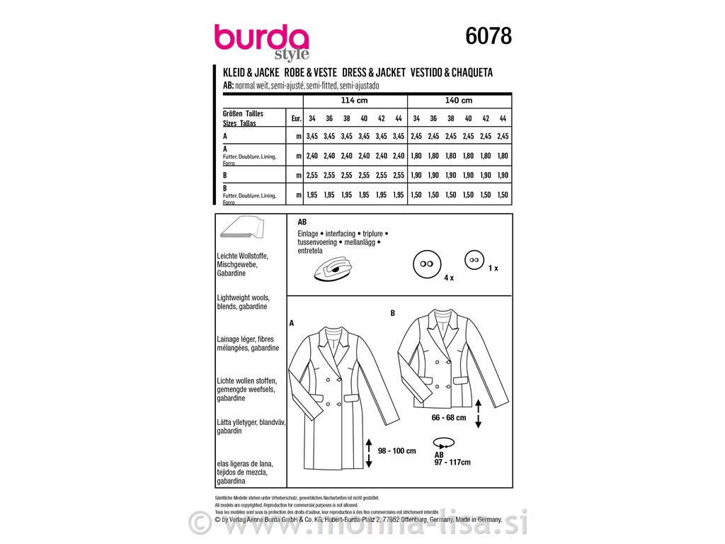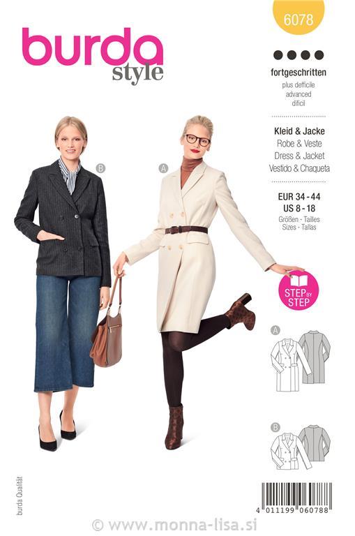 Kroj za ženski blazer in blazer-obleko, ki imata dvojno zapenjanje in žepe s poklopcem.