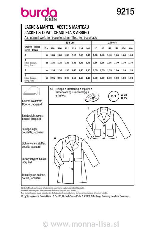 Kroj za dekliški elegantni plašček in jakno / blazer. Oba sta telirana z lepim ovratnikom na fazono, zapenjanjem na gumbe ter našitimi žepi ali poklopci.