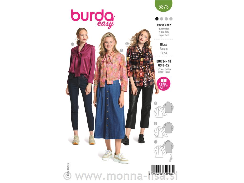 Kroj za žensko elegantno bluzo z dolgimi ali 3/4 rokavi ter šalnim / kravatnim ovratnikom, ki ga lahko zavežete tudi v pentljo.