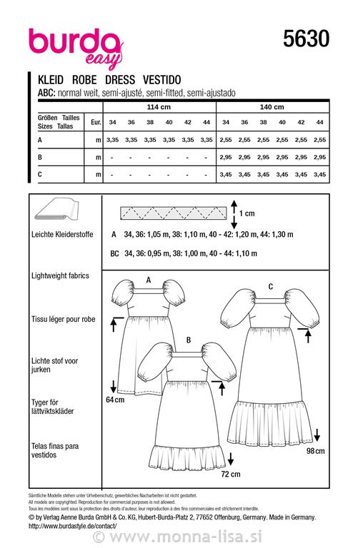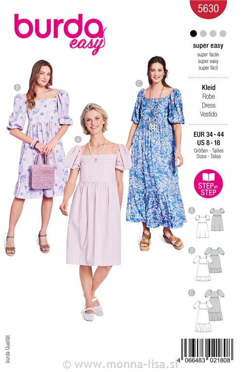 Kroj za žensko poletno romantično oblekco in obleko, saj dolžino skrojite po vaših željah. Izrez je štiroglat in z nabranimi rokavi. Obleka je rezana pod prsmi ter rahlo nabrana. Na dolžini lahko prišijete volančke za še več volumna. Obleka bo idealna izbira za vaš poletni dopust.