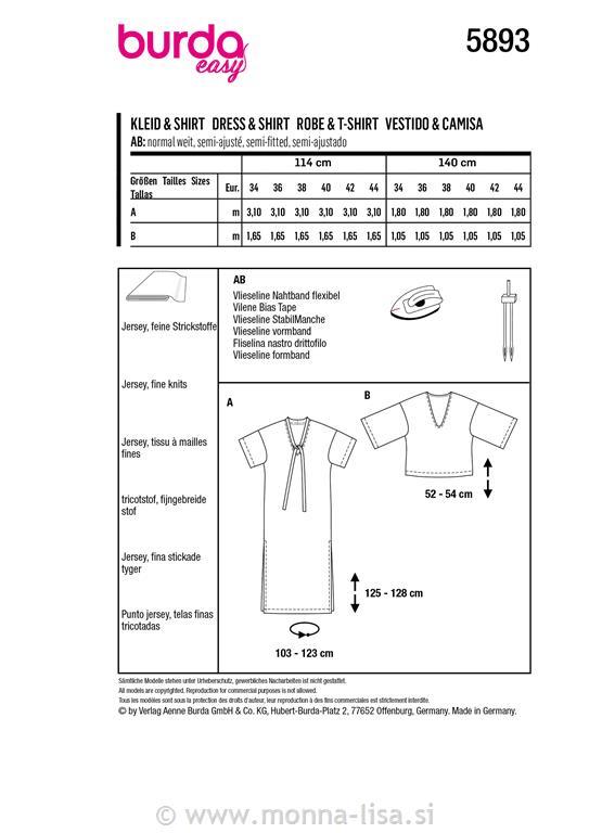 Kroj za žensko majico in obleko z V-izrezom, kjer sami izbirate dolžino rokavov (kratke ali 3/4). Na izrezu lahko dodate vrvico ter se poigrate z razporki na dolžini obleke.